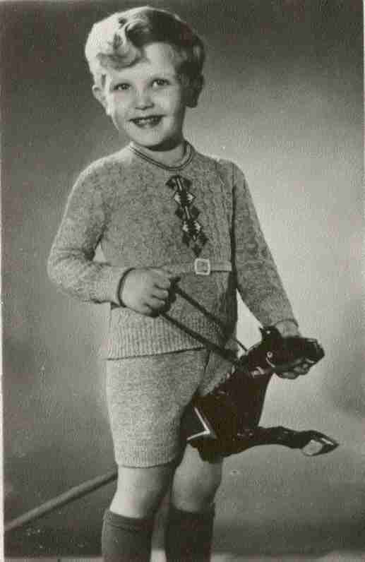 We believe English boys were wearing knit suits in the alte 19th century, but do not have images to substantiate this. We do have images the turn of the century. The oldest image in our archive is dated 1915, but we believe they were worn earlier. Some of these outfirs are clearly hand made. Even by 1915, however, we believe there were ready made knit suit outfits available. Most of the English knitsuit sets were short pants outfits intil after World War II.
