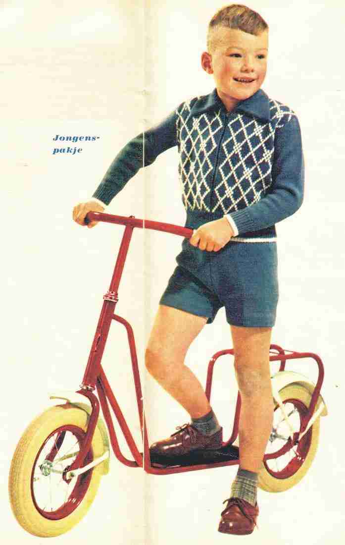Sweaters were often chosen to go with pants of a similar or contrasting color. Although not very common, we have noted knotting magazines offering patterns for sweater sets with matching sweaters and pants. The sweaters for these sets varied, but the pants were often, but not always shorts. The knit was always the same. The color was commomly the same, but not always. The sweaters often had a pattern, the pants were normally solid colors. The pattern for this sweater set was offered in a Dutch knitting magazine, I believe during the 1960s. I'm not sure what ages the pattern was offered for, but the boy here looks about 5-6 years old.