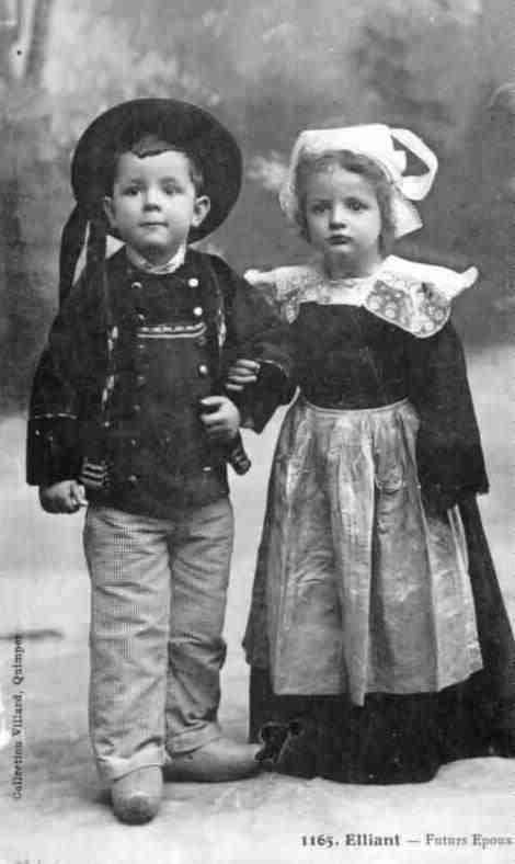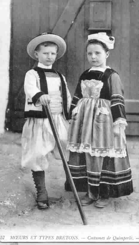 spires) ne figuraient évidement pas sur le costume ordinaire. Le métier de brodeur était généralement masculin. On notera que les femmes et filles portent de simples tabliers et bonnets de toile, alors que les costumes de fête comportent des tabliers et bonnets de dentelle raffinées. Les bretons (un vieux peuple d'origine celtique) très
