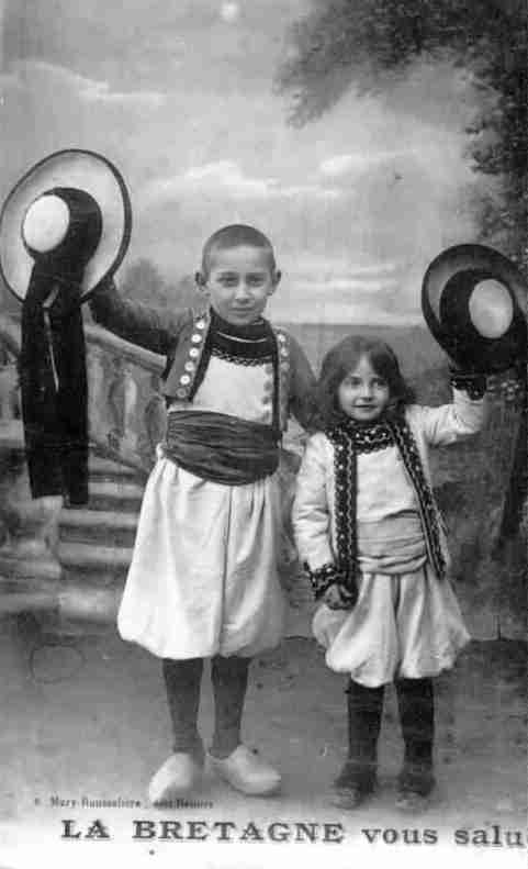 Another image shows two children welcoming tourists to Brittany. These postcards were prfimarly made to sell to tourists. The older child is a boy. I'm not sure about the younger child. This postcard was used,it bears a hand writen message in french at the back, but was probably sent under envelop as there is no stamp. Marked in front, at bottom under the image" La Bretagne vous salue" Translating to " Brittany greets you." The children wear short jackets with baggy trousers. Each has a wide brimmed hat with ribbon and wear wooden shoes.