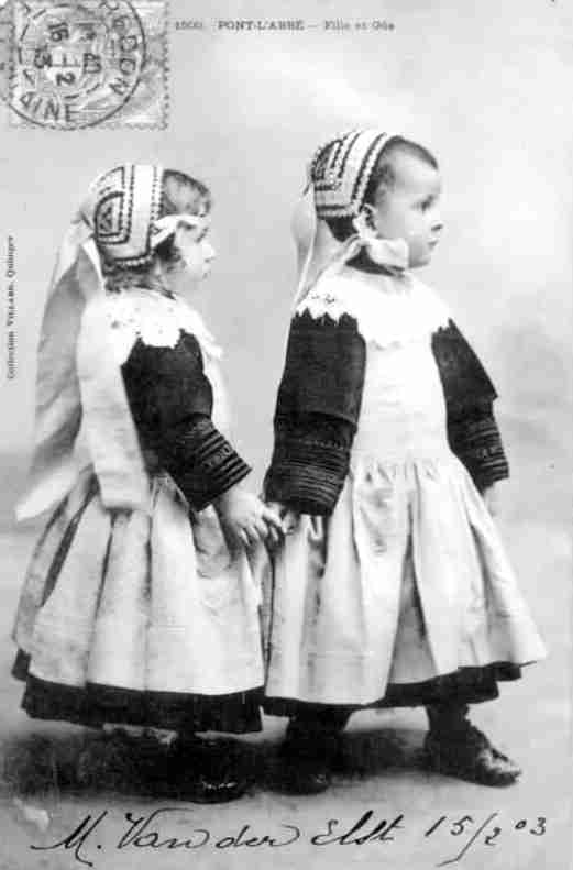 Brittany is a region of northwestern France, the most westerly extension of France. Brittany has a fascinating history explaining the tenacity by which the region has clung to its language and customs, including their destinctive dress. Only in the 20th century has Brittany been fully integrated into France. At the turn of the 20th century, Breton culture was much stronger than is the case today. The first postcard pictured here was made about 1903. The children, a boy and a girl, are dressed in almost identical outfits. In Brittany it was the custom for boys to wear dresses in their early years.