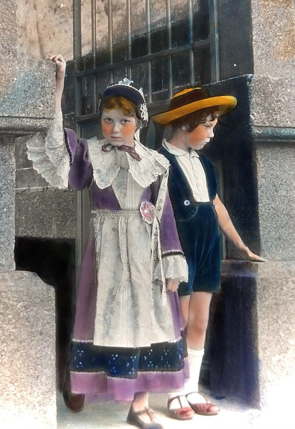 HBC does not have details on ethnic dress in the Pyrenees. Presumably they are strongly influenced by Basque customs and dress. The children pictured here wear berets with jackets and knee-length pants wtth white stockings.