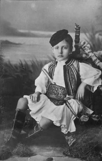 The costume called Foustanela, established by Otto, the first King of Greece, as the formal in the middle of the 19th century, prevailed in the urban centers of Moreas (Peloponnese)and Roumeli (Central Greece). This dress was originally the military outfit of the Greek chieftains. The costume was soon modified by the men for holidays and other festive occasions. The outfi tthat is shown here has two jackets, the inner waist coat, the yileki, and a second sleeved shortjacket, the fenneli, with the sleeves falling freely over the back. The material that was used for this version. is wool. The embroidery is made of spun wool andthe belt is of a fine leather work.