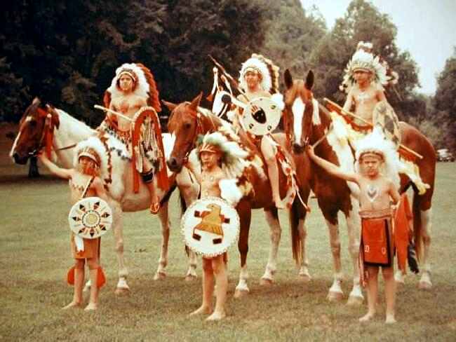 We have found some Native American lore programs in settings that we can not readiily identify. They may well be simmer camp activities or perhaps some kind of civilc or other festival It is often very difficult to tell unless the photograph is identified. We note one very elaborate Native American depiction in a wide open field without any clues whatsoever, just elaborately costumed boys and horses--a rarilty in Native American lore programs. The boys are done up so elaborately, it is almost as if they are in a movie or some kind of pagent. A car in the background dates the iscane to the mid-50s. It is an early Kodacolor print. Given the age of the boys, I don't think the horses were part of a Native American program. This could be just a photograph taken for some reasons than a real program. Unfortunately we just dont know anything about this group. A reader writes, "If I had to guess it had to be a summer program due to the no shirts etc. of Indian clothing which then makes me think it is some type of summer program, scouts, camp etc." I agree it is cerainly a summer scene. I don't think, however, that it is a Scout event or even a summer camp. The horses are part of the reason here. I don't think that Scout camps and most summer camps had horses like this. And also note that there are not acoutements of camp life in the background, just aide open field. So we are not sure just what the group here is.