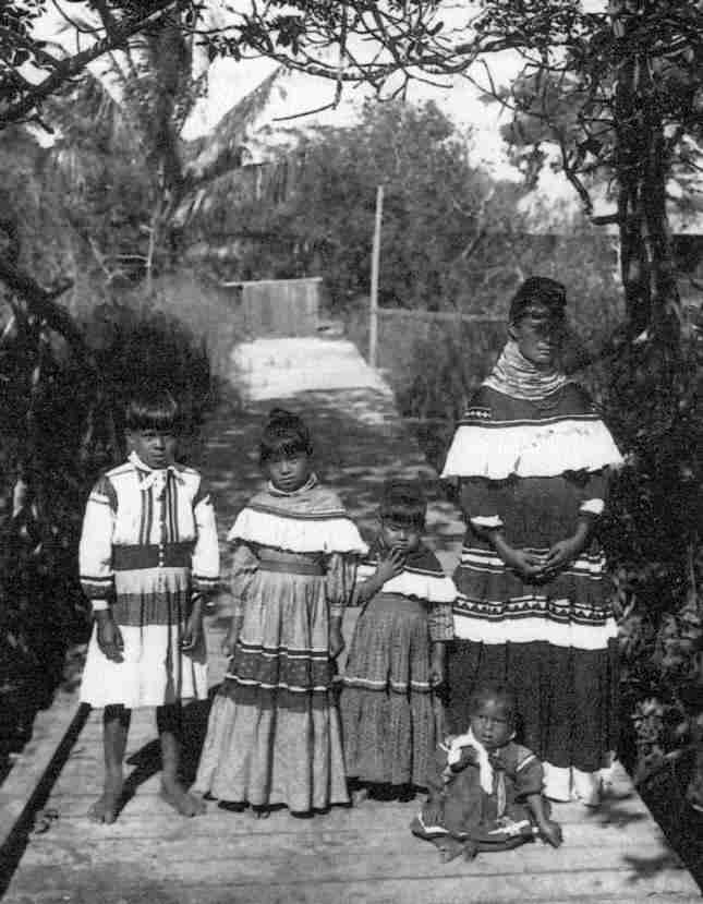 Here a Seminole mother is pictured with her four children fressed in brightly colored traditional clothing. Their camp can be seen in the bckground. The girls wear full length dresses. I am not sure about the origins of the garments, but there seems to be a Spanish influence. The boys wear knee-length dresses called "long shirts". Usually the skirts were knee-length or slightly below the knee. Some were calf length. These garments for men and boys are called long shirts. These traditional garments were still quite common as late as the 1920s. These traditional garments gradually declined in popularity. By the 1950s only a few old men and very young boys wore the old-time skirted garments.