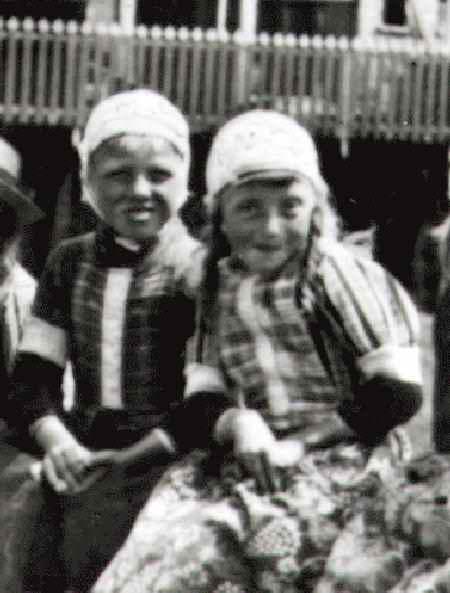 The Marken Island children in dresses most commonly wore little white, often enroidered bonnets. Most seem to have had chin straps. Some seem to have been more like caps worn on top the head, but the mmore common type was a white bonnet worn securely over the head and ears and drawn tight with a chin strap. Some bous even wore these bonners after being breechhed and their curls cut. While this was the most common headwear, there were a variety of other styles worn by the children.