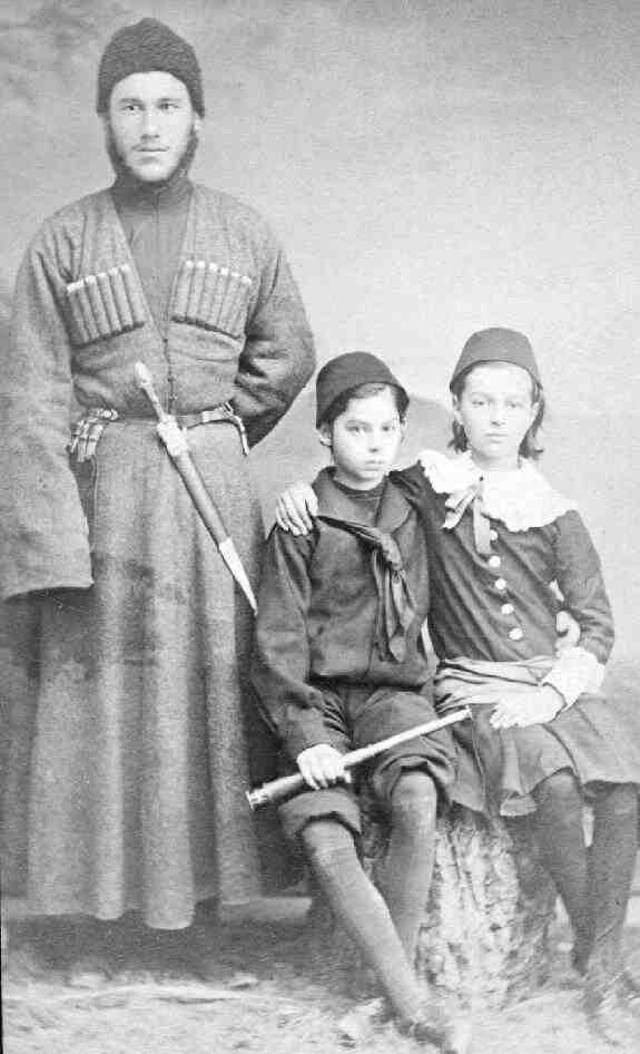 Figure 1.--These portrait taken about 1900 shows a father and his two children. The father wears a Cossock coat. Notice the fezes the children wear--a Turkish influence. I have never seen a girl wearing a fez before. Except for the fezes, the children wear Europea style clothes. |