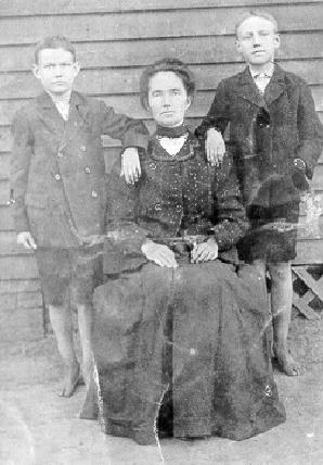 All we know about the image here is that the mother's name was Alice (figure 1). Both her sons wear kneepants suits and go barefoot. Neither boy has a fancy collar. Notice that the one boy has his collar buttoned. We would guess that this photograph was made about 1910. It may be that the boys do not wear fancy collars becuse the style as the fashion was being to go out of style.