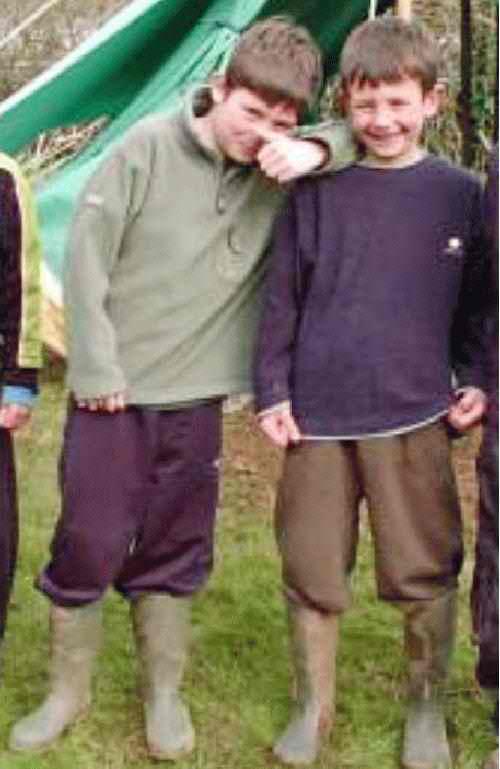 No country is more associated with wellies than England. I'm not sure when they fitst appared in England, but believe that it was before World War I (1914-18). We know that they were being worn after the War. Virtually every British boy since that time has worn Wellington boots or "wellies" at they are affectionally calledf some time in his life. Most of us grew up with Christopher Robin and remember his wellies. The heavy and frquent rainfall in Britain, make wellies very practical footwear. They were not specifically made for children, but were worn by adults as well for outdoor activities. They are common at boarding schools where children may wear them outside during the often inclement weather. Masters at the schools find them even more useful in trapesing after mud-spattered children. The wellies of course can be taken off at the door and thus mud is not tracked into the home or school. One HBC reader remembers how he hated the wellies that his mother made him wear as a primary schoolboy in the 1960s. He disliked the bother of having to cary his shoes with him after he had to take off his wellies in the cloakroom. Most of the English wellies we have seen are black, but white and colored wellies were also worn. A reader reports that up until the 1980's, British wellington boots were predominantly all black. However, since then, green wellington boots have become far more popular in Britain. Today, most British people, both adults and children, have green wellington boots which have beige soles. Green wellingtons were apparently made popular by members of the Royal Family in the early 1980's. [Alcock] HBC notes in the 2000s that fashionable children's botiques were offering "lots of colorful wellies" for younger children.