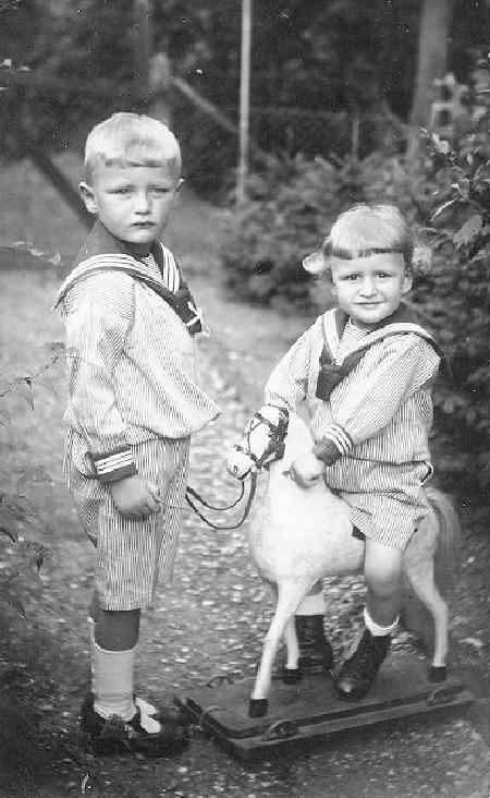 ![]() Figure 1.--These two German brothers, probably photographed in the 1920s, wear identical striped sailor suits. Note that the older brother wears strap shoes and the younger brother high-top shoes. |
