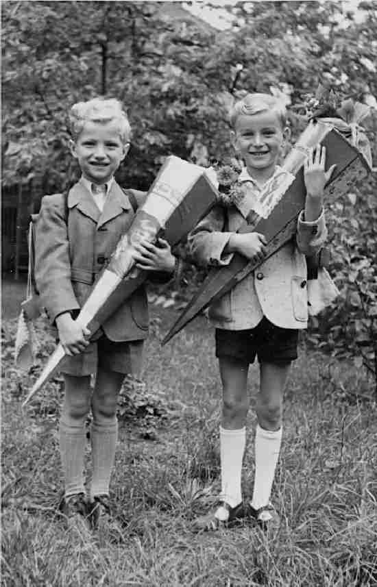 We note boys in many countries wearing closed-toe sandals in the 1950s. There were very substantial differences among countruies, especially between America and European countries. We note sandals being offered by the Sears catalog in the early 1950s. An example is the 1950 catalog. This was the double bar style which curiously onlt had a half center strap rather than the more common full center strap. While we see them in the catalogs, we do not see many American boys wearing them. I do not recall bots in the 50s wearing them nor do I note them in the photographic record. We do note that closed-toe sandals, especially school sandals were very common in England. The most popular style was the "T"-strap school sandal, but we also see double-strap sandals. They were also worn in Scotland. We also see them worn in various European countries such as France and Germany. As in Britain, they were often worn to school. The most common style in most countries was the single bar with a center strap like the British school sandal. Here we see German boys on their first day of school in 1952. One wears closed-toe sandals in a rather adult style (figure 1). We also notice many Dutch school children wearing sandals in the 1950s. A good example is a Dutch school class. We also notice French boys wearing English style school sandals at school, we think n the early 1950s. They are not nearly as common as in Britain, but we notice a few boys wearing them in many schools during the 1950s.
