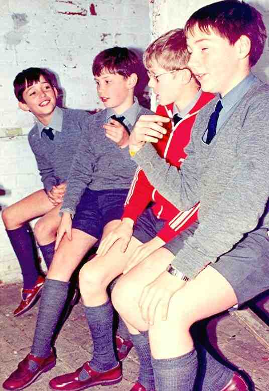 School sandals were less commonly worn by English boys in the 1980s. They were, however, still worn by younger boys at primary schools as well as at many private preparatory schools. Several prep schools required them as part of the school uniform. Here we see a prep school scene in 1986 that required the standard school sandal (figure 1). Some schools selected the style such as the sansal with the narrow center strap. When the style was not set the boys often wore the sandal with the wude center strap. The most common colors were brown shades, but we also noticed a fe boys wearing dark blue sandals. The most common style was the "T" strap. A few boys wore the double cross strap style. We also note English wearing them. We also see Scottish boys wearing clsed toes sandals, especially for school. A good example is a 1982 school scene.