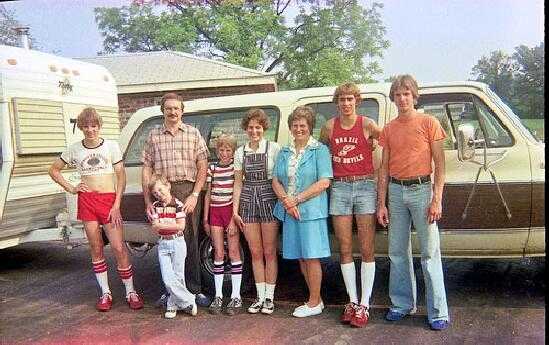 Tube socks were worn by boys of all ages wearing shorts. They were most poular with pre-teen and early teen age boys, but older teenagers and men also wore them. The Indiana family here is a good example of the age range involved (figure 1). Tube socks appeared at a time when more American boys were wearing shorts, even older teenagers. They werre wearing some of the casual, athletically styled shorts that younger boys were also wearing. While tune socks were most common with school-age boys, we see them being widely worn by teenagers, especially boys intetested in sports.