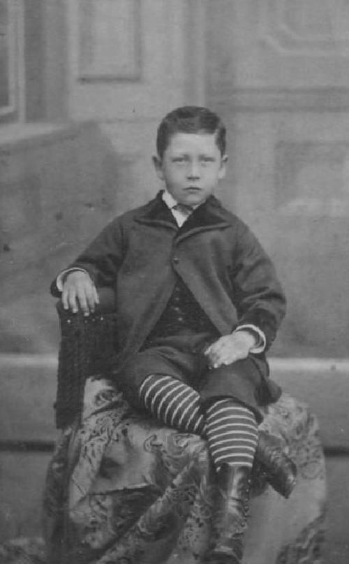 Canadian children generally wore solid color long stockings, but we have noted some patterns. The most common pattern was strips. In many cases the stripes were done i quite bold patterns, althoughwe are not sure about the actual colors. We are also not yet sure about the chronlogy, but they seem especially common in the 1870s-80s. We believe these stripped stockings were worn by both boys and girls. They see to be rather sporty, but boys seem to wear them with dressy outfits. Some times the suits are rather sober, making the stockings really stand out. We are not sure how common they were for more formal occassions like church. We do not know if te children had any preferences about these stockings. These seems more an American than a British style, but we are not yet positive about this.