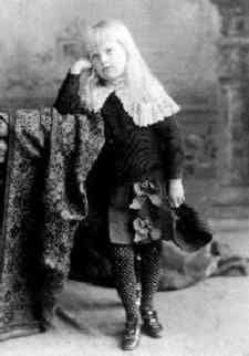 We have occasionally noted boys wearing other patterned stockings, but am not precisely sure at this time how to describe the platterns. Boys wearing these patterened stockings are generally yoinger boys not yet breeched or boys wearing fancy Fauntleroy suits. This is largely a late 19th century fashioin, although some boys may have worn these other patterned stockings in the 1900s, but we have not noted them in the 1910s. We have noted these patterened stockings in both black and white, but doubt id these were widely worn in other colors. A HBC reader believes that the boy shown here wears long stockings in a kind of diamond pattern (figure 1). We have noticed modern tights for girls with desisns as part of a pattern--usually white tights. We do not know if 19th or early 20th century long stockings had these designs. If so they were not very common.