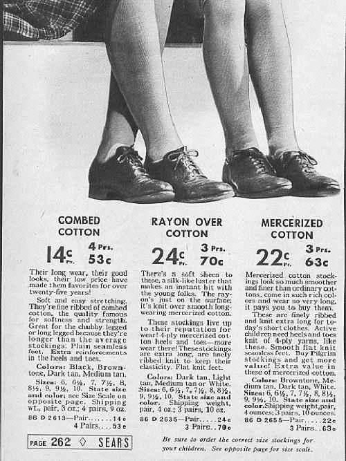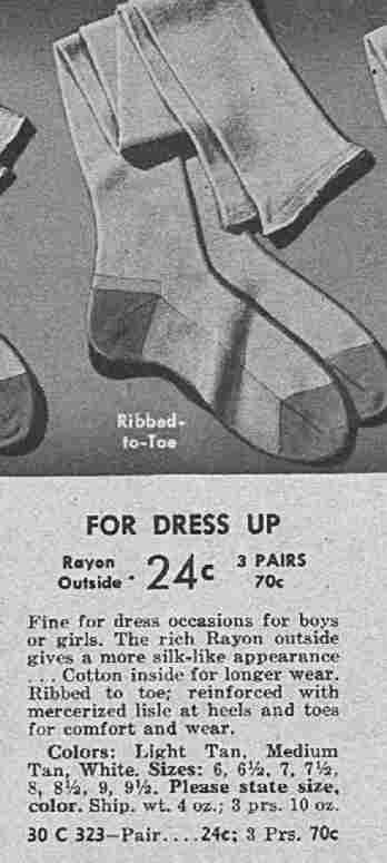 Ther's a soft sheen to these, a silk-like luster that makes an instant hit wityh the young folks. The rayon just's on the surface; it's knit over smooth long-wearingbmercerized cotton. These stockings live up to their reputation for wear! $-ply mercerized cotton heels and toes--more wear there! These stockings are extra long, are finely ribbed knit to keep their elacticity. Flat knit feet. Colors: Dark tan, Light tan, Medium tan or white. Sizes: The size range is from 6 to 10 in half size intervals. Cost $0.24.