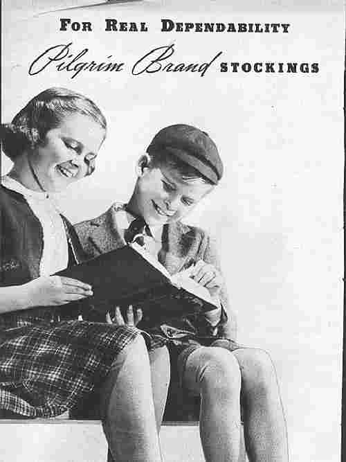 Mercerized cotton stockings look so much smmother and finer than ordinary cottons, come in such rich colors, and wear so very long. They are finely ribbed and knit extra long fot today's short clothes. Active children need heels and toes knit of 4-ply yarns like ghese. Buy Pilgrom stockings and get more value! Extra value in these of mercerized cotton. Colors: Brown stone, Medium tan, Dark tan or white. Sizes: The size range is from 6 to 10 in half size intervals. Cost $0.22.