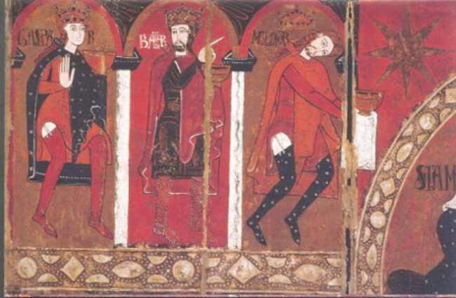 The image here is apparentlt from a 13th century French "painting". We do not have any specifics on the painting. I think it must have been colored in the original, probably a panel painted on wood. We do not know where the original is located or who painted it. We thought it might be a wood cut If you look carefully, you can see that the image does not have the characteristics of a woodcut, though I suppose some sort of engraving is possible. Here we have a 13th century painting showing two of the three kings (magis), Caspar and Melchior. The image is especially interesting because it shows the way stockings were sometimes supported as early as the 13th century. This French painting (13th century) depicts Kings Caspar and Melchior, two of the three kings who visited the Christ Child in Bethlehem to present their gifts of gold, frankincense, and myrrh.