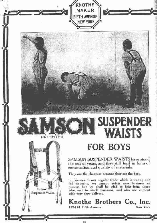 ![]() Figure 1.--This ad appeared in the "Boys' Outfitter" in 1919 stressing the flexibility of the Sampson Susppender Waist made by the Knothe Brothers. |