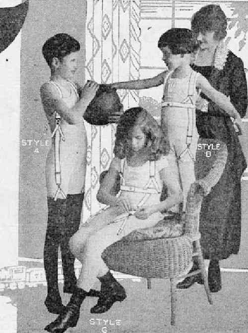 We note two different types of these suspender garments. The Samson suspender waist seen here are a combination garment. The waist was to hold up the boy's trousers, but there were also hose supporters. The Kazoo ad, which has both girls and boys wearing suspender waists, illustrates a point that I think needs to be clarified. The suspender waists for older boys are designed with attachments for trousers. This model was not for