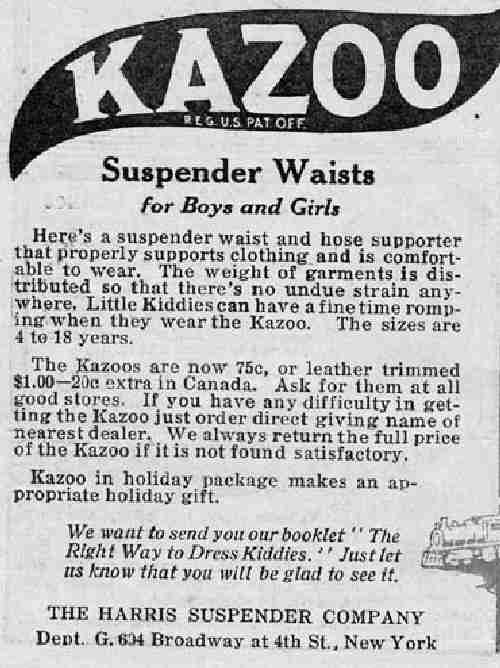 At this point various kinds of suspender waists began to replace the bodice-like underwaist or "pantywaist" for boys, and various models such as the Wilson, Sampson, and Kazoo suspender waists were widely sold as alternatives to hose supporters supported only from the waist. See HBC pages suspender waists and stocking supporter types. The new models appealed to boys because they were more athletic, more masculine, and more grown-up. The strain of the garters was carried by over-the-shoulder straps like adult suspenders for trousers such as boys' fathers usually wore, and the new suspender waists often had attachments for both trousers and stockings so that the waists served a dual purpose. Several advertisements for the Kazoo model that appeared in Good Housekeeping magazine, for instance, encouraged mothers to buy the new type of suspender waist for their growing sons so as not to embarrass them by keeping them too long in old-style "feminine underwaists" as a means of supporting their long stockings.
