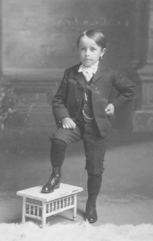Boys from wealthier families who wanted to wear strict formal dress could be fitted out with adult-style tuxedos, as shown by a 1901 advertisement for boys’ suits. The suits had knee pants, of course, and were worn with smoothly woven black long stockings. A charming photo of Fred Arthur Rowe from Spencer, Iowa, shows him wearing a double breasted knee pants suit with a bow tie and what seem to be plain black stockings or at least stockings woven in a very fine-gauge ribbing.