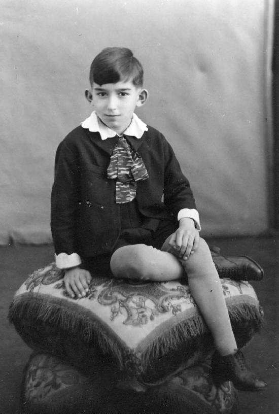 We tend to see boys weating flat-weave stockings when dressing up. This was, however, not always the case and we see quite a number of boys wearing ribbed stockinmgs when dressing up. We note two American brothers, the older of whom wears a knickers suit with adult-style shirt and tie while the younger wears a sailor suit with short pants and ribbed black stockings(figure 1). An American boy, Richard Strock, of about 9-10 years of age wears above-the-knee knickers about 1921-22. Richard wears the new form-fitting brown or dark tan ribbed stockings. These stockings are quite dressy in appearance. Note that Richard wears a natty bow tie. As could be predicted, boys dressed for their first communions in both Europe and America tended to wear short trousers or knee-pants outfits with smooth-weave black or white stockings. Canadian boys, especially in Quebec, wore long black stockings of smooth texture for several decades, so that it is sometimes difficult to pinpoint the date very accurately. A portrait of a Canadian boy is tentatively dated in the 1920s, but the quite short trousers and the obvious length of the stockings mean that it could be as late as the 1940s or even 1950s. Notice how form-fitting and dressy the stockings are.