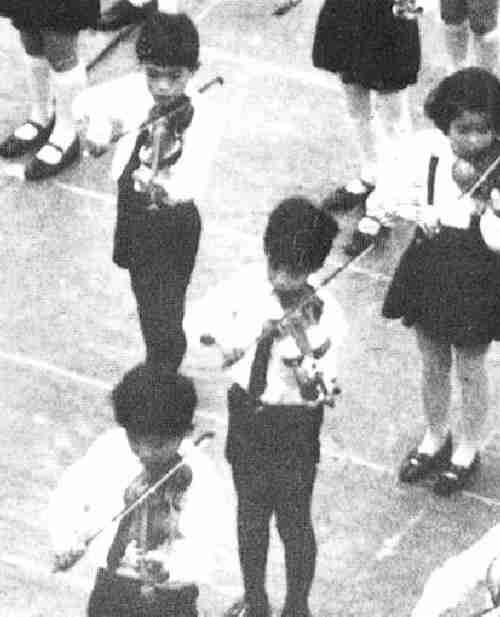 ![]() Figure 1.--Japanese boys in Suzuki recitals usually wore white shirts, ties, blue short pants, and white kneesocks. Some boys wore tights, black and wite tights were the most common. |