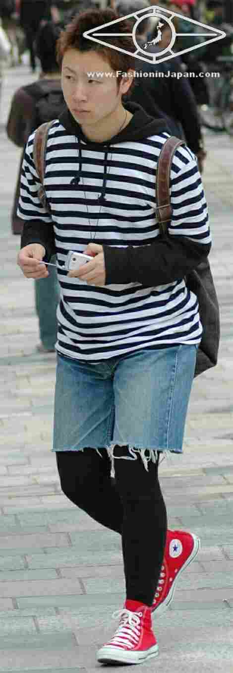 We notice some images of Japanese teenagers wering tights with cut off jeans as a kind of funky outfit. We do not know how popular such a fashion is. This stands in sharp contrast with the younger boys wearing tights. Here the image is basically well behaved children, often nicely outfitted in formal clothes chosen by their parents. The teenagers wearing tights seem to be aiming at more of a funky rebellious image. We are not sure when this styl first appeared, but we first note it in 2005. A HBC reader writes, "I ran across this image in a Tokyo streetwear website. Here is a Japanese teenager wearing cutoff denim shorts layered over black tights. The image appeared approximately February, 2005."
