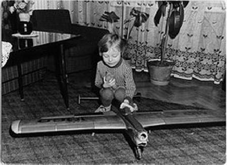 HBC has noted magazine advertisements of boys and girls wearing tights at home without pants. This looks like a casual style just as American children might wear pajamas before going to bed or early in the morning. We are unsure just how common this was. Perhaps these scenes were just used by the companies involved as advertising to give prospective custimers a better view of the tights. After all a boy wearing long trousers over tights would hardly make an effective illustration of the tights. We do know this was common in Polish Kindergatens. And the believe it was fairly common at home as well. A reader writes, "The photograph here shows a small boy (about 3 or 4 years old) playing with a large toy airplane at home (figure 1). He wears a warm sweater, short trousers, and either tights or dark long stockings. Long stockings were still worn in Poland during the 1960s even though many parents substituted tights."