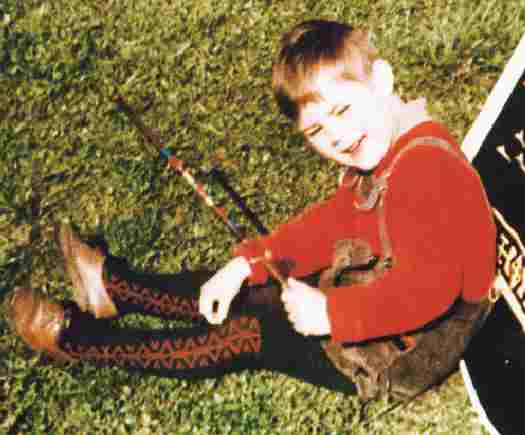 Lederhosen are worn with a variety of hosiery. Some boys wore a comination ankle sock and calf band. Other boys wore knee socks. During the winter, younger boys weore tights with lederhosen. Although not as common as with other types of hosiery, tights were worn with lederhosen. HBC has few details, but they seemed to have been most poular with the longer knee-length type of lederhosen.