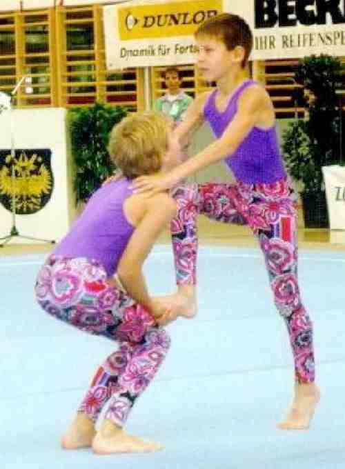 ![]() Figure 1.--These boys are practing a gynastic trick. HBC believes that these are German boys. Wearing tights for gymnastics appears more common in Grmany than America. |