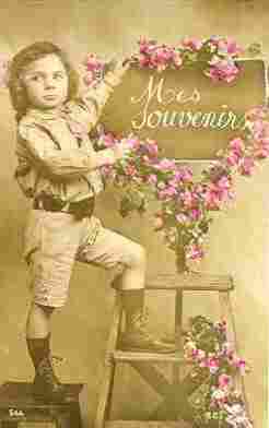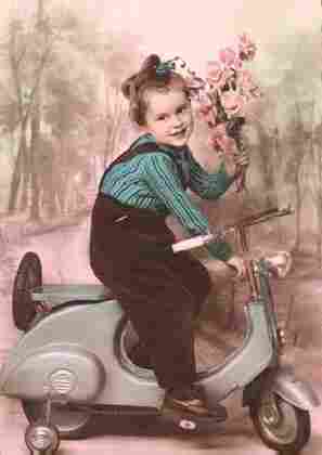 or short pants outfits. They continued to be worn in the years before World War I (1914-1918). A small minority of boys wore them. This is suugested by the fact that only a few are pictured in French postcards--despite the fact that the boys in these cards are often depicted in fancy clothes. The relative importance of this fashion over time is difficilt to asses as boys commonly did not swear hairbows at the time, but just for speciall occasions. Hair bows for boys became much less popular after the War, except for very young boys. Some of the hairbow images are difficult to interpret. The 1920s photograph of the child on the scooter shown here is a case in point. The It may be a a girl as by the late 1920s hairbows for boys had become less common as was long hair for boys. There are several factors, however, suggesting it is a boy. Girls at the time did not commonly wear pants. Other aspects of the photograph suggest that it may be a boy: especially the clothes and shoes. Also this was not the 1990s. You would not expect a girl at the time to jump on a scooter and ride off.