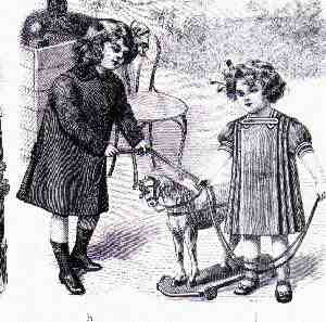 York, 1994 provides some information. Illustrations show boys with hair bows. Some of the boys are in dresses, some in skirts, and others in pants. The first is from 1884 and show two children in skirts and jackets (figure 1). The one on the left is identified by the author as a girl of 4-6 years and the one on the right as a boy of 6-8 years. However, she is probably mistakenly identified. There are both boys and the one on the left misidentified because of the hair bow. The reason for beleiving they are both