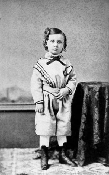 Quite a few of the images of boys wearing hairbows that we have acquired come from the late 19th century. We can not say definitively that they were more common in this period. A factor here may be that just that there are a lot more portraits taken in the late 19th century. Declining costs and rising affluence resulted in many more portraits. The increasing numbers pf photographs being taken is a major factor. Longer hair styles began to become more common in the late 1860s and 70s. HBC believes that it is at this time that mothers began adding hair bows to their sons' long hair. A good ecample is the Powell family in 1886. Another example is an unidentified American boy in the 1890s. HBC believes that this is also about the same time that girls began wearing prominent hairbows, but this needs confirmation.