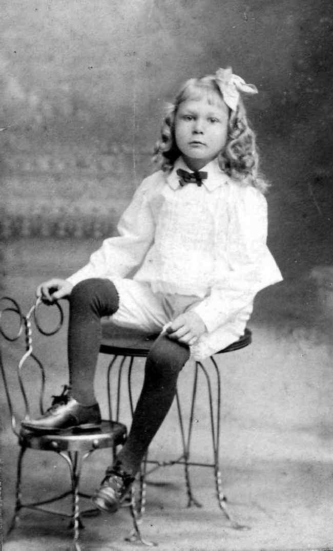 The unidentified boy looks 6-7 years old in the second portrait and has long wavy curls rather than tight righlets. His haie is quite a bit konger, falling to his shoulders. This is a little older than most boys we have noted with hair bows, but not by any means the oldest. He wears a fancy white blouse, but not as fancy as the Fauntleroy blouse he wore when younger. The collar is a lottle unusual with a fancy blouse. It was an Eton collar, probably a detachable collar. Rather than a large floppy bow, he wears a small black bow. His pants are bloomer knickers rather like the ones commonly worn with tunics. He wearrs dark, probably black long sockings and low-cut oxford shoes.
