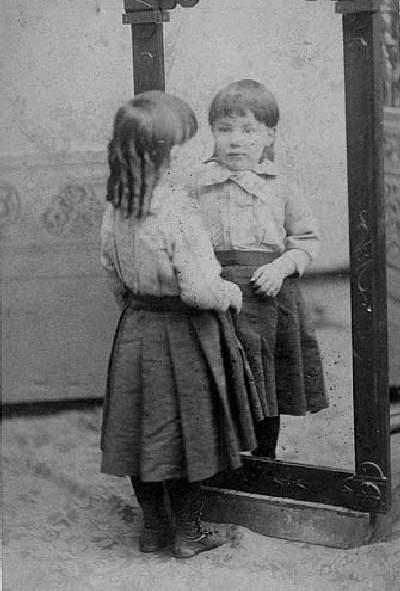 The fall of the ringlets varies depenfing on how the hair is combed. Back curls may reflect the fact that the hair has been cut at the side and allowed to grow in the back. We are not sure why a mother would chose this style because the ringlets could only be seen to good effect from the back. The hair would be cut sometimes quite short at the side and allowed to grow out at the back. Notice all the ringlets here are done behind the ears (figure 1). The hair would also have to be combed a little differently than styles with side curls which normally had center parts.