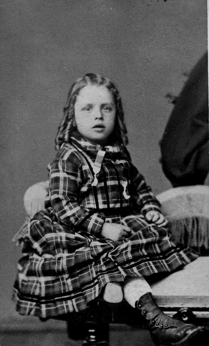 We note boys not yet breeched wearing various skirted garments, especially dresses and kilt suits. A good example is an unidentified Lynn, Machachusettes boy wearing a plaid dress (figure 1). Plaid dresses were popular for boys because the plaid pattern they had a kilt look about it. The portrait is undated, but as it is a CDV, we ould guess it was taken in the 1870s. He looks to be about 3-years old. We also see Highland kilt outfits, although they were not as common as kilt suits. We notice Robert Stanley Mitcheson. about 1870 wearing a Highland kilt outfit with ringlet curls. Tht was not so common in America. The photograph is by the Manchesten Bros., Providence, Rhode Island. I believe that this is a boy. The fact that the child has a book is one clue that he is a boy. He also can be identified because he is wearing a suit jacket. And girls did not wear kilts. On the previous page is an unidentified Providence boy, probably from the late 1860s or early 70s wearing a velvet kilt suit.