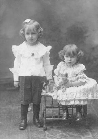 It was not just twins that had their their style coordinated. It was probably more common to coordinate the cloths, but many siblings also had coordinated hair styles. Again this was most common for like-gender siblings, but hair style cordination was by no means limitd to siblings of the same gender. There are many different alternatives here, especially in large families. For example a mother might outfit the boys similarly and then style the younger boy's hair like his sisters. We also notice many instances where the children are dressed quite differently, but their hair styles are identical or coordinated. Also some mothers may choose identical and others similar styles, perhaps age graaded in some way. Similarly mothers may select both identical and similar styles such as ringlet curls with differnt parts. This was most common of course for same gender siblings , but it was also done for brothers and sisters as well. We note an example of an American brother and sister with coordinated hair styles about 1905. We note another American brother and sister, this pair with idebntical hair styles, although the boy is younger and has shorter hair.