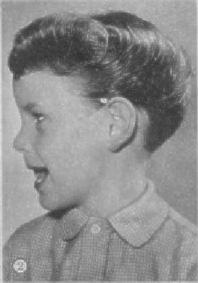 Womens magazines in France provided advise to mothers about boys' hair styles ("coiffure pour garçon"). The description for the hair style above (figure 1) read, "The hairstyle for the child has an undulated (wavy) look, but built-up at the front. The top of the forehead is held in place by some small locks. Each side and the back are also swollen. This style for the boy is slightly girlish so as not to make the child look too old." The French text reads, " La coiffure pour enfant prèsente un mouvement non seulement ondulé,mais gonflé sur le devant, le haut du front restant ombré grâce à quelques petites mèches.. Les côtés et la nuque sont également gonflés. Ce compromis de coiffure masculine est un peu féminisé pour ne pas vieillir l'enfant." [Femmes d'Aujourd'hui, July 1956] About the French trnslations. A French reader tells us, a sissy look for a boy is a look fillette or " allure fillette " ( slightly pejorative ). A boy effeminated ( un garçonnet a peu efféminisée has negative connotations today. This wss not the case in the 1950s and it was not sen at the time specialy harmful. It mean that the boy was delicate in his attitude and in his traits. This was considered quite normal and many mothers preferred such boys o riugher more agressiv boys.