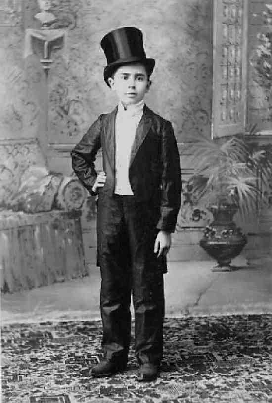 While primarily an adult style, toppers were also worn by boys, although this was not very common. They were worn by some boys from wealthy families in the late 19th and early 20th centuries. This portrait may show a British boy in an Eton suit for formal wear and not a school uniform. While the top hat was normally associated with men, boys did wear them. This would normally be boys from wealthy families. We are not sure just what would be the conventions involved here. Perhaps it was just for special occassions. Some boys may have worn these hats as part of an elaborate costume, but we think that boys from wealthy families actually did wear them on occassion.
