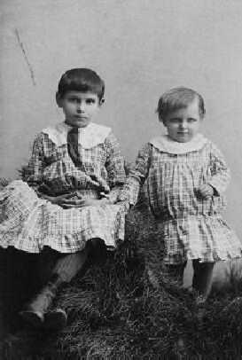 The two children in figure 1 wear the same plaid dress. Note there are no front buttons as is often the case for boys' dresses. While their dresses are identical the child on the left, clearly a boy, wears a differently shaped collar than the very young child on the right. The boy on the left also appears to have an untied bow--unusual in a formal portrait. Despite the age differencem their mother has decided to dress them in the same dress. The question is, what does the difference in the collars and the bow mean mean. It strikes me that this mother has taken so much care to buy or make identical dresses that the collar difference is probably not an accident. I know of no convention by which boys in dresses would have different collars. Thus it is likely that the younger child is the boys' sister. Note that the two collars are shaped differently. One tendency current at the time was to used rounded collars on girls' dresses. While not always used for girls, the rounded collar to seem to be more commonly used for girls. Also note that the younger chil's collar go fully around the front while the boy's collar appears to have a front cut.