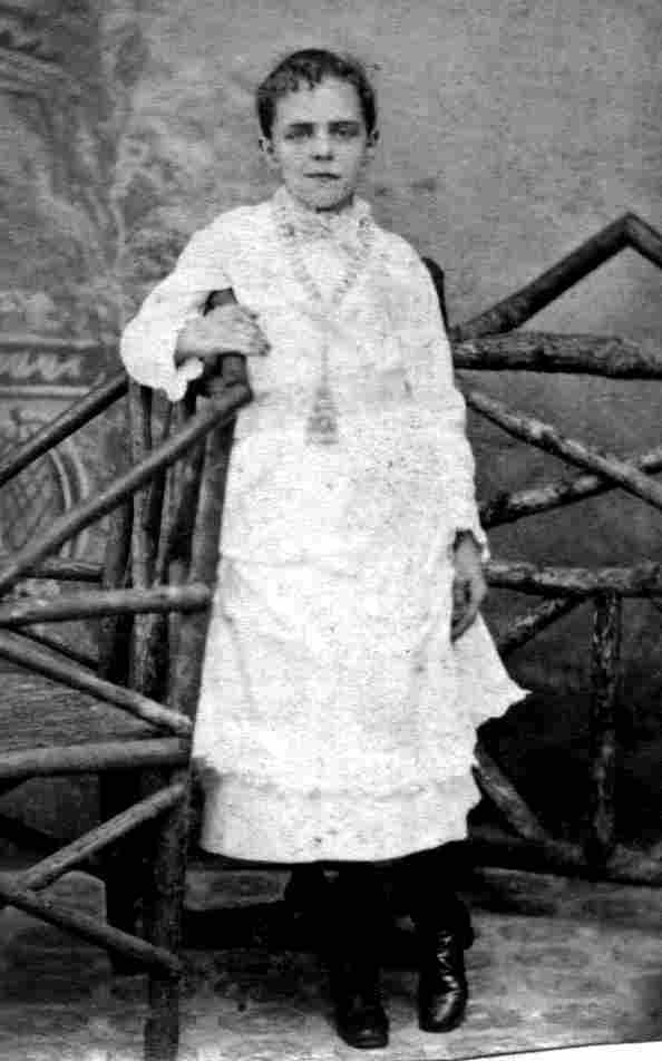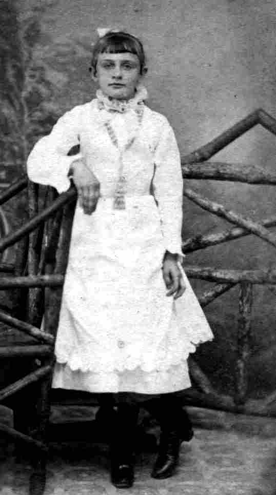 A HBC contributor wonders if this was Albert's normal attire or was this a special picture. This relates to a question HBC has posed elsewhere and is as yet unable to answer. Was a boy breeched all at one time or did he continue to wear out his dresses before having them replaced. Actual data is at this time unavailable. HBC believes, however, that once breeched, mothers even in the 19th century might have difficultly outfiting their sons in dresses for portraits and other special occasions. These children look fairly old perhaps 8 or 9 years of age. The children here appear to be wearing smocks--but with dresses underneath. Notice the scalloping detailing at the hem of the smock which is repeated in similar wrist trim. I'm not sure what the collar is attached to. Note that everything was identical--even the shoes and pose. (HBC has not yet extensively addressed shoes. Shoes for children may have been sdimilar for both genders. Of course adult shoes were quite common.) The basic difference with Addie and Albert is the hair. Addie has a slightly longer cut and wears bangs and a hair bow--Albert does not.