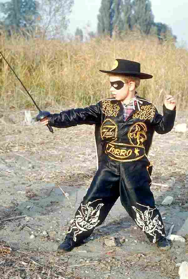 Costumes cover a wide range of characters.  They have varied greatly over time among boys as well as among countries.  .  Media have played a major role in popularizing characters.  In the early 20th century it was books and magazines that popularized characters.  We see cosrumes for cowboys, indians, policeman, and soldiers.  Indian costumes seem to have been particularly popular.  Movies and radio began to affect the popularity of characters and even more so television afrer World War II.  Hopalong Cassidy was a big hit for a while.  The Davy Crockett craze swept America in the mid-1950s vecause of the Disney program.  The Zorro costume here was another Disney TV phenomenon (figure 1).  The Starwars films created a whole new series of popular costumes.