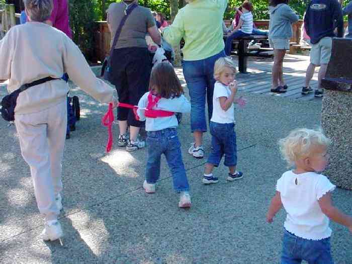 The modern children's walking harness appear to be less commonly available in America than in some Ruropean countries, especially Britain. We have no information on the 19th century. What we thought was a child's saftey harness in 1900 Sears catalog turns out to be more likely a play for children's games of horsey. We do not recall seening many parents using saftey harnesses during the post-World War II era. A HBC reader who wore one has a todler, however, tells us that they did exist. We note a Chicago mother using one at a parade in 1958. The move to the suburbs after world War II may have reduced the need for saftey harnesses as it was a relatively secure environment. We have noted increasing numbers of saftey harneses in the 1990s and 2000s perhaps reflecting an increasing parental concern with saftey and security.