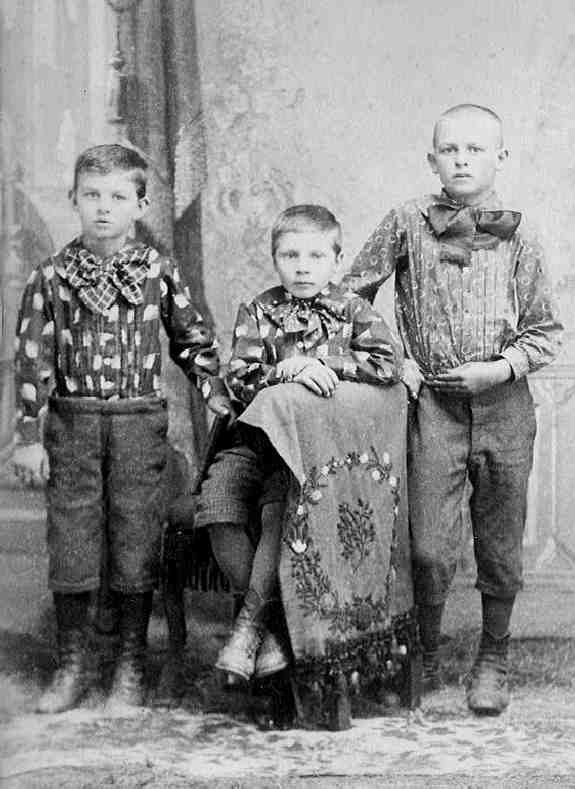 ![]() Figure 1.--This unidentified portrait was taken by W.H. Grover in Springfield, Missouri. It is undated but would have been taken in the late 1890s or early 1900s. All three brothers wear blouses, floppy bows, and blouses with kneepants. Note the two types of front opening. The boy on the left has a front flap wityh side buttons. The bpy on the right has a center fly. |