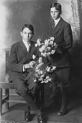 The first knickers seemed to have had a band of material of material designed to fit snuggly around the leg. This was necessary to close the knickers and keep them from falling down. There was no way go close the bloused knickers unless the leg opening could be narrowed. This band was done in the same color and material as the rest of the knickers, although I think it was two or three oply for strength. There were buckles and buttons on this band used to close the leg hem at the knee. The overlapfrom the fully bloused knickers tended to cover up this band. We have, however, some photographs with knickers that were not so fully blouced that clearly show this band. We do not yet have any images of the actual fassening arrangements. The overlap obscured the fact that the knickers commonly buckled above the knee. Some knickers had enough material that they could be buckled below the knee if the boy so chose. Boys apparently preferred to do this, but some parents objected. There appears to have bben a fabric band that bucked that could be moved up or down. Knickers in the 1920s seem to have been made with less bloucing, but we have not yet found an image showing the bucklng arrangement.