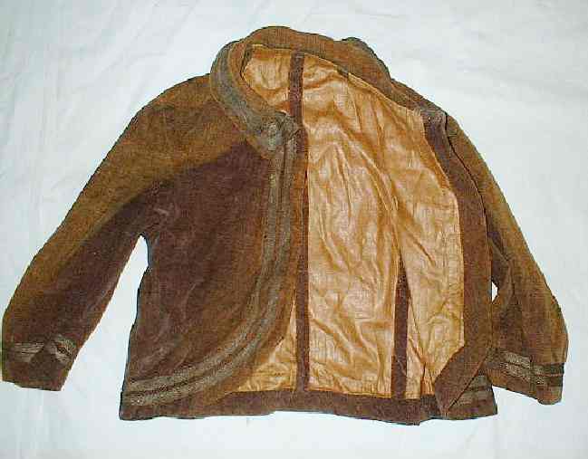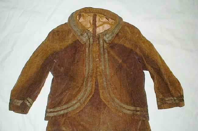 This suit was for a little boy, but we have no information on the age. We do have the measurements which is useful in assessing the age of the boy who wore this suit. The jacket measures approximately 11 1/2" across, from shoulder seam to shoulder seam, x 15" long (down the back, from the top of the collar), x 13" around the collar x 12 1/2" down each arm (from the top of the shoulder seam, to the end of the cuff) x 8 1/2" down the sleeve from under the arm x about 14" down the front x 28 1/2" around the entire jacket (measurement taken under the arms). The pants measure approximately 23" around the waist x 14" long (down the side of each leg) x 6 1/2" down the inside of the leg x 10" around the bottom of each leg. I think it might be about a boy's size 4 or 5, but I'm not sure.