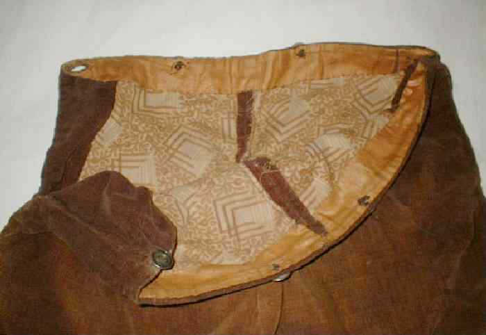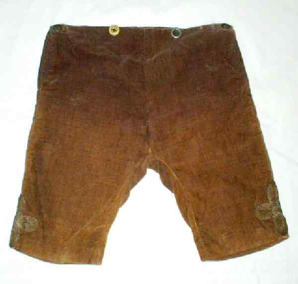 Corduroy was not a fabric used in proper Fauntleroy suits. It was a relatively inexpensive fabric while velvet was an expensive fabric. Corduroy was meant to be durabble and a popular fabric for schoolwear. The owner selling the suit describes the material as "brown velvet". We are not sure what that mean. We think it just means corduroy. Corduroy does have soime of the feel of velvet. The pants button at each side and have two buttons in the front and two in the back.