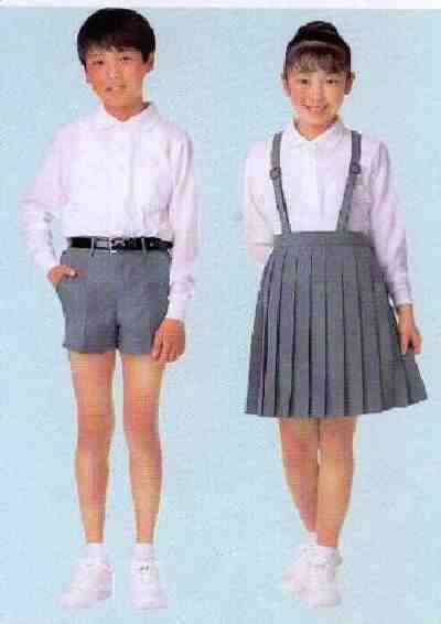HBC still has very little information on suspender shorts in Japan. I have noted younger children wearing suspender shorts. School age children wear them less commonly. Boys commonly have worn short pants, although has changed considerably since the mid-1990s, however, they generally do not wear suspender shorts. Notably, girls at Japanese schools wear suspender skirts, but boys generally do not wear suspender shorts. HBC's Japanese consultant reports that some private elementry schools have suspender shorts for their uniform, but it is rather rare. He confirms that suspender skirts for girls are very common throughout Japan. AnAmerican reader writes, "Some younger schoolboys in Japan were wearing suspenders with their shorts when I last visited there in ????. They weren't suspender shorts as such, just shorts held up by clip-on suspenders. I've seen the same thing on
